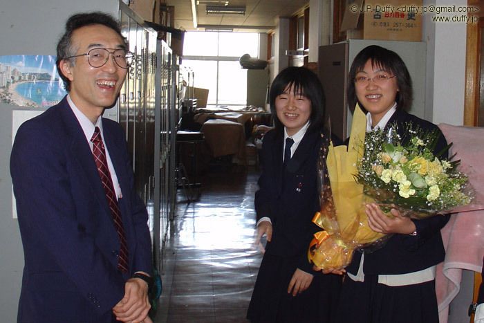 Today all the teachers who changed schools returned to their old schools for the afternoon.  Teachers are required to change schools every 10 years, and have only minimal say in where they are reassigned.  In this picture some students are giving flowers to one of our very popular former teachers.