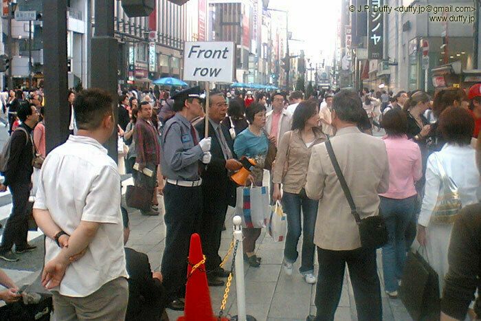 I'm sorry this picture is so bad.  Today is the world premier of Tiger, and this is the front of the line to buy it.  The row of people goes on for 3 city blocks, after which another rent-a-cop has a sign designating the end.    Hold on a moment-- What is that burning plastic smell?... Oh, the building across the street appears to be on fire.  Huge plumes of de-combusted polymerization wafting into my apartment.  But tragically the building is not aflame, it is merely the waste removal technique of choice in Japan-- The residential plastic bonfire.