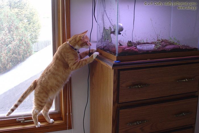 Bad Kitty! I opened the window for a second to throw out a bug, and she jumped out. I had to climb up onto the roof to get her. I finally get her back inside, and she runs right up to the same window and paws at the screen. It was quite an adventure for a house cat. Just don't show this to my roommate, it's his cat.