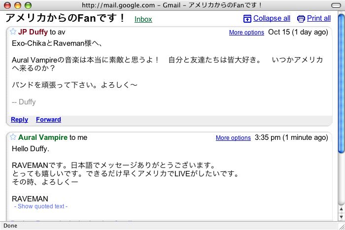 I emailed "Aural Vampire," a Japanese band I like, and they replied!