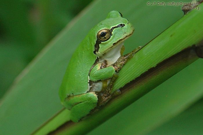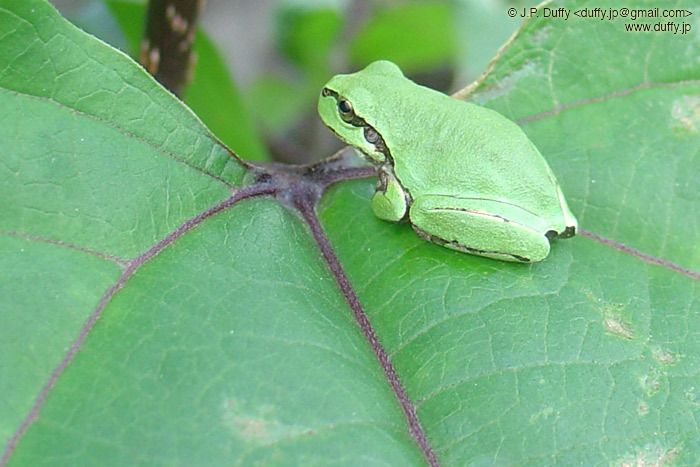 It's still a bit rainy today, but I felt like looking for Tree Frogs again-- so I went out anyway. And I'm glad I did! Along one long farm road, I found three populations of tree frogs. Two frog communities were somewhat close to each other, while the third was a good 500 meters away. The neighboring frogs all had brown stripes on their hind limbs, but the frogs in the separated area all had solid green (as pictured here). It seems the separated group is genetically distinct from the larger group.