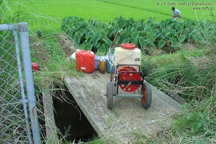 I went out looking for my little green friends, but none were to be found. In the same places as Thursday the grasses were empty. I took a picture of some farmers spraying their vegetables instead. I don't know the word for "pesticide" or "fertilizer" in Japanese, so I couldn't ask which. I wouldn't have asked anyway, but it's a long story. Well, maybe I can summarize it for you. Grade school kids treat all foreigners like we're wearing Mickey Mouse costumes. Junior and high school kids treat us like movie stars. College kids think we're cool. Working age people are generally polite. But the older members of society see us as outside that society. Imagine for example, someone outside of your society. Lets say one of the space aliens from the Sigourney Weaver movies bicycles up to you with a camera and says "hi." It might freak you out.