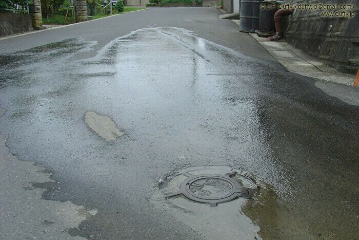 This street has been leaking water for two weeks. If you look closely, you can see the water bubbling from the man-hole cover. Actually, it's a bit small for a man; let's call it a penguin-hole cover. In any case, I'm hoping the apparent burst water pipe is repaired soon.