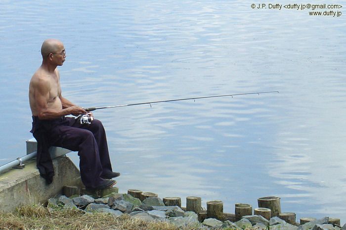 The sky is blue today! I took the opportunity to take some pictures. I consulted my Chiba-ken festival book, and found today to be the last day of the Tako Gion-sai festival in neighboring Tako-machi. The thermometer outside my apartment read 37'C. This temperature happens to be exactly 98.6'F. Sounds fine, I'll be invisible to heat-guided missiles. When I arrived, I found the town to be fairly empty. This guy was fishing in the channel the guide book showed the townspeople floating down in boats. I investigated a little further, and found the events were actually to take place at night.