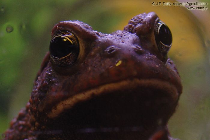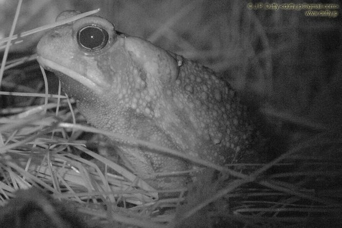 I took this picture in complete darkness at around 10pm. I used the infrared mode on my Sony Camera. I guess toads don't sleep at night.