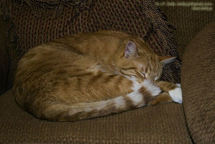 Georgia looks so cute sleeping on my chair. A house-cat's natural camouflage seems to be an easy chair.