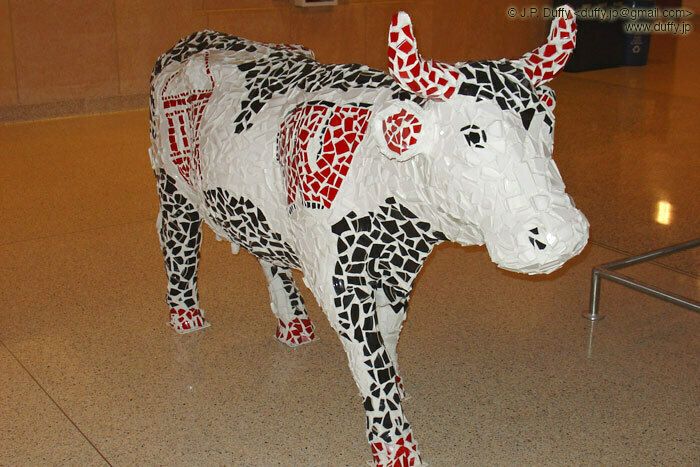 There was a cow statue made out of broken plates in the Atrium of the Health Sciences Learning Center today. Any bets on how long before someone trying riding it?
