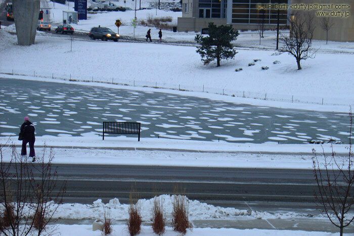 This is the frozen pond on the hospital grounds where I work. The ducks still haven't left.