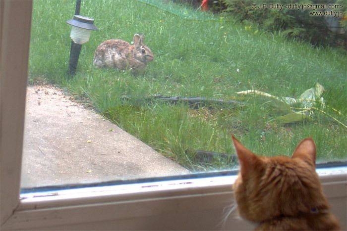 Georgia checking out a rabbit in the yard. Both animals were so motionless I could take several HDR photos of them.