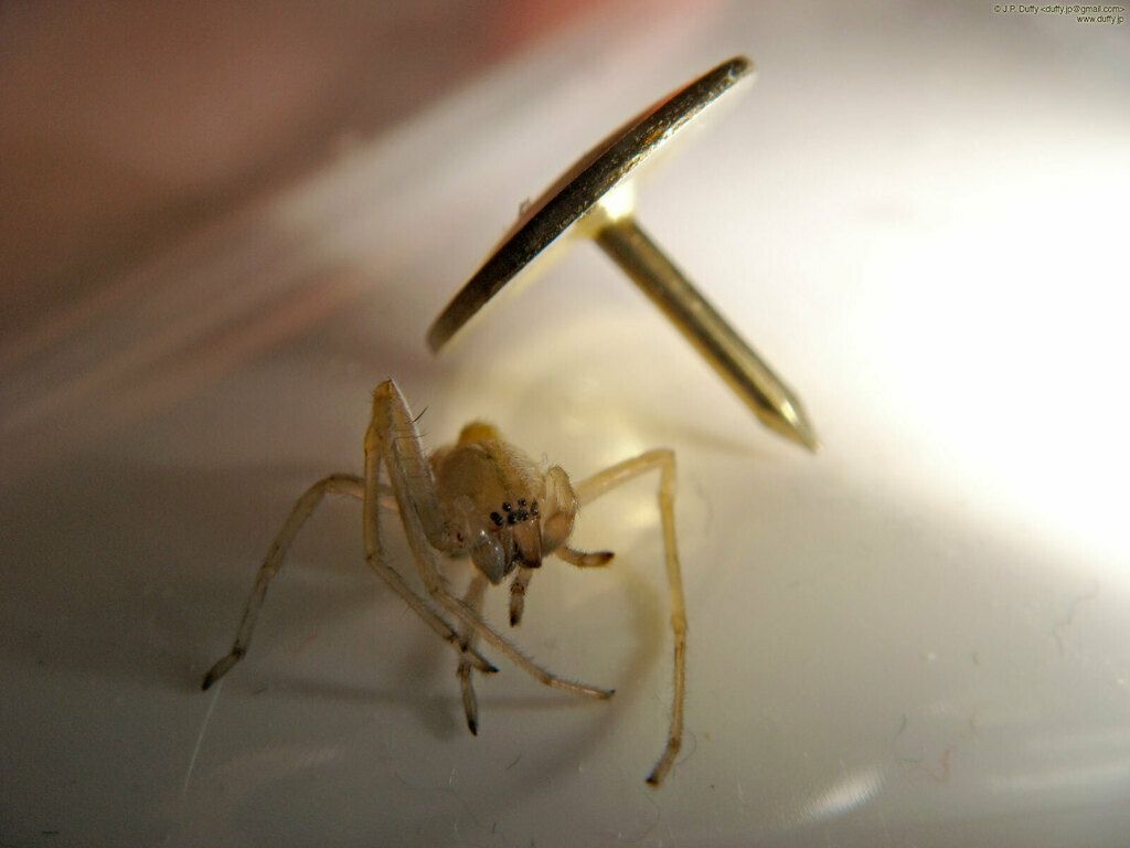 I got a lot of compliments on the spider picture from April 6th, so I thought I'd try doing it again and maybe giving up my secret. This spider is the same type as the previous photo. You can get an idea of his size in relation to the thumbtack in the background. The trick is just keeping the spider still. In both photos I did this by capturing him on clear packaging tape. Last time I got him upside-down so it looked like he was suspended in air. This time he was a bit more awkward. The next key is focus. I set the camera to the closest possible focus and use the viewfinder to try and focus on his eyes. You move the camera in and out until you have a mental average of the best focus, then shoot. I took eighteen shots at various angles and got three I was happy with. This one was my favorite for a number of reasons. Most importantly the focus was dead on for the spider's eyes and the edge of the tack. Another part I liked was that the flash bounced off the inside of the tack and filled the spider with a matching golden light. This photo was taken on a Sony T-100 in super-macro mode with image stabilization on. Hand-held 1/40sec, F5.3, flash on lowest setting. Photo is reduced in size but not cropped. Only editing was to remove a stuck sensor pixel that started showing its ugly face around photo 10,000 on the camera.