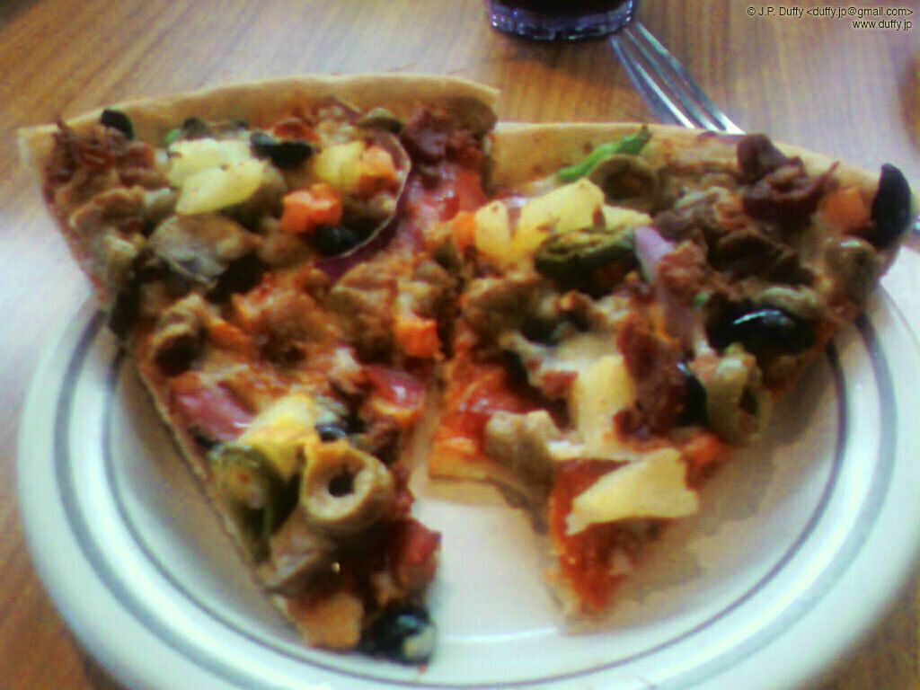 "Super mega ultra supreme" pizza at Pizza Hut. Strutz, Myris and I went to Pizza Hut for the buffet today. They give you the option of ordering anything you want to be placed on the buffet table. I used the opportunity to its fullest. "I'll have a super mega ultra supreme thin crust please." Following a blank stare by our waitress, "ok sure," she replied. They put every single topping on this pizza. It was overwhelmingly awesome.