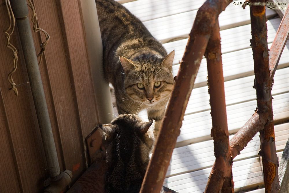 These two cats were howling at each other for a good hour before a neighbor came outside and threw rocks at them. They weren't overly bothered by being photographed.