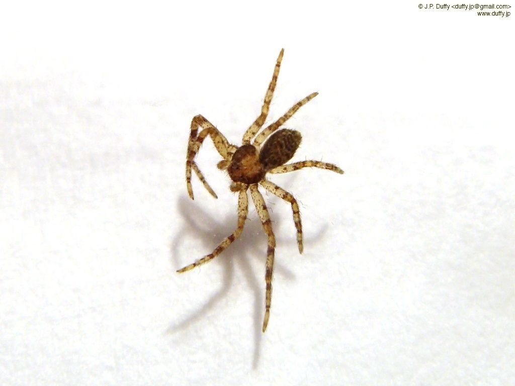 Tiny spider I found on my ceiling. After photographing it, I measured it at 6 to 7 millimeters wide leg to leg. Body is about 2.5mm long. It's still alive and well, although I don't know that I'll be able to get it off the adhesive in any manner agreeable to the spider. This spider is much smaller than either of these:
