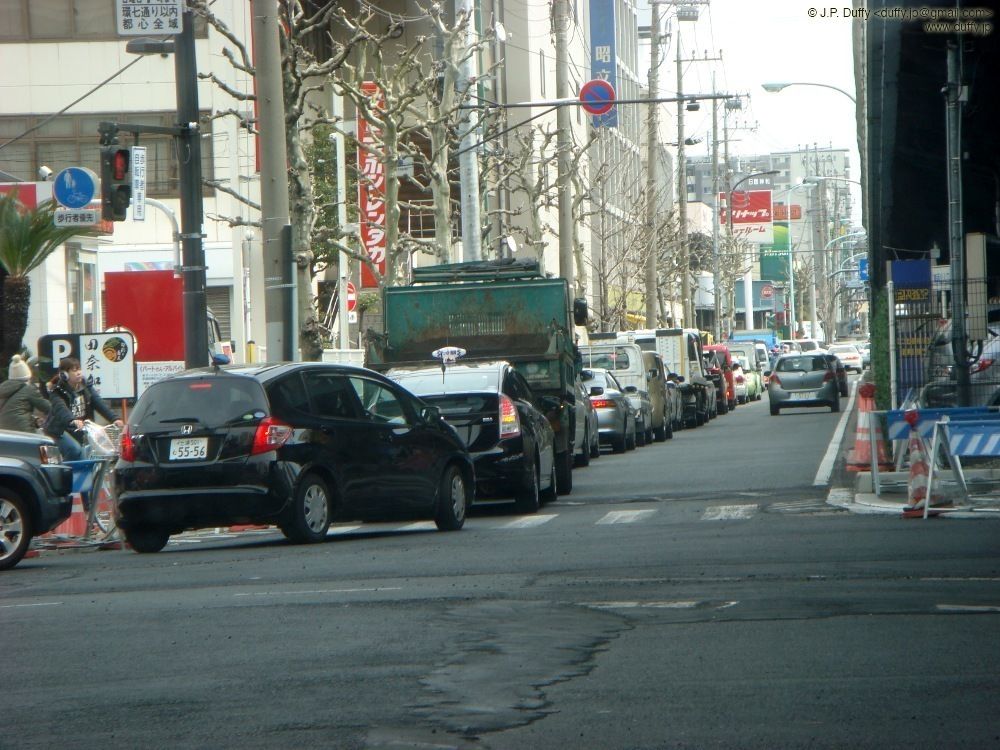 Fears of a fuel shortage lead to a run on gas stations. This queue was two blocks long. Many stations sold out. I saw one station that decided to price gouge at 3000 yen / liter, or about $140 / gallon. All the other stations were selling at a normal 150 yen or so. Hopefully that's illegal here as it is in the states.