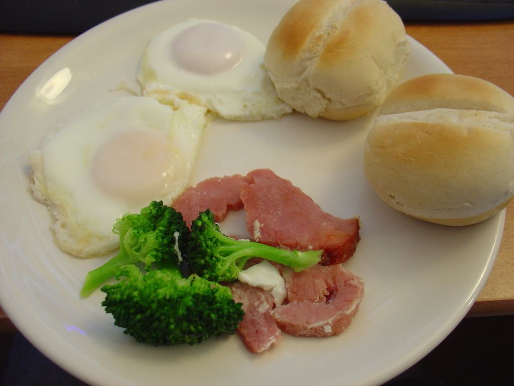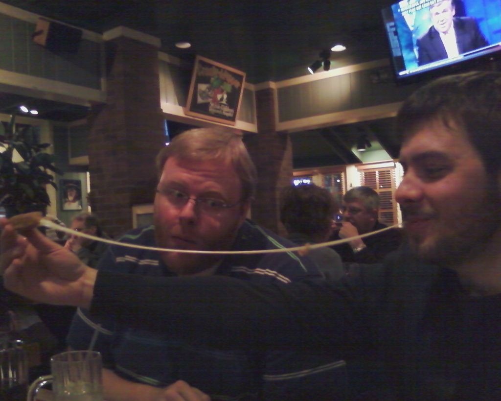 Mitch enjoying a fried cheese stick in front of Jared who's vegan this month to win a bet.
