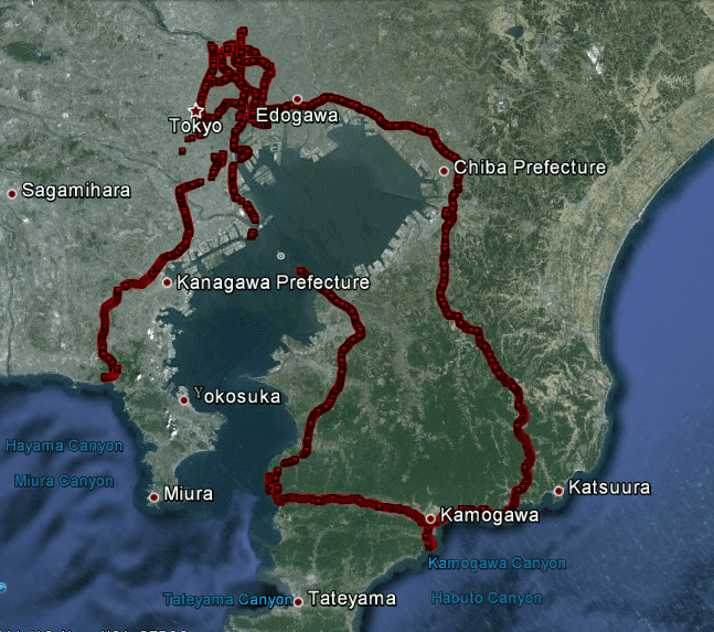 Here's a map of were we've been so far. The part where it looks like we drove out into Tokyo Bay was when we used the Tokyo Aqua Line tunnel. It's about a 15km stretch between the Tokyo side and the Chiba side. 2/3 is a tunnel under the bay, and 1/3 is a bridge. Where the tunnel and bridge meet they built a huge rest stop with shops and restaurants.