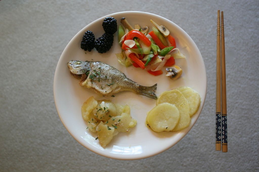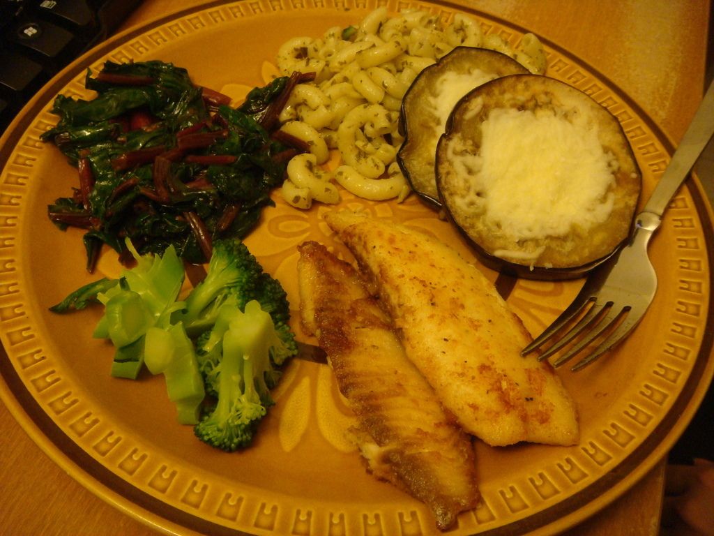 Masami spoils me. Tilapia, eggplant, basil pasta, red spinach, and broccoli.