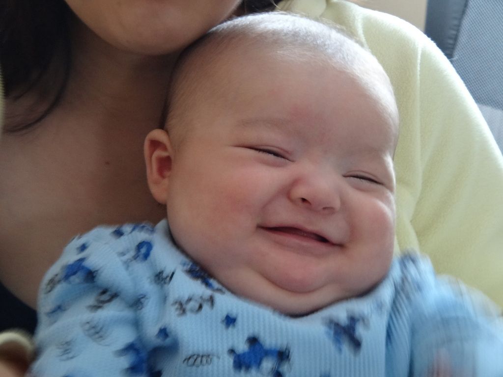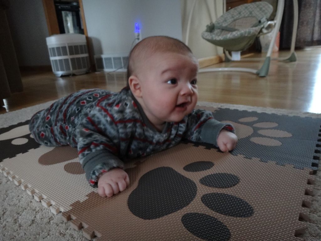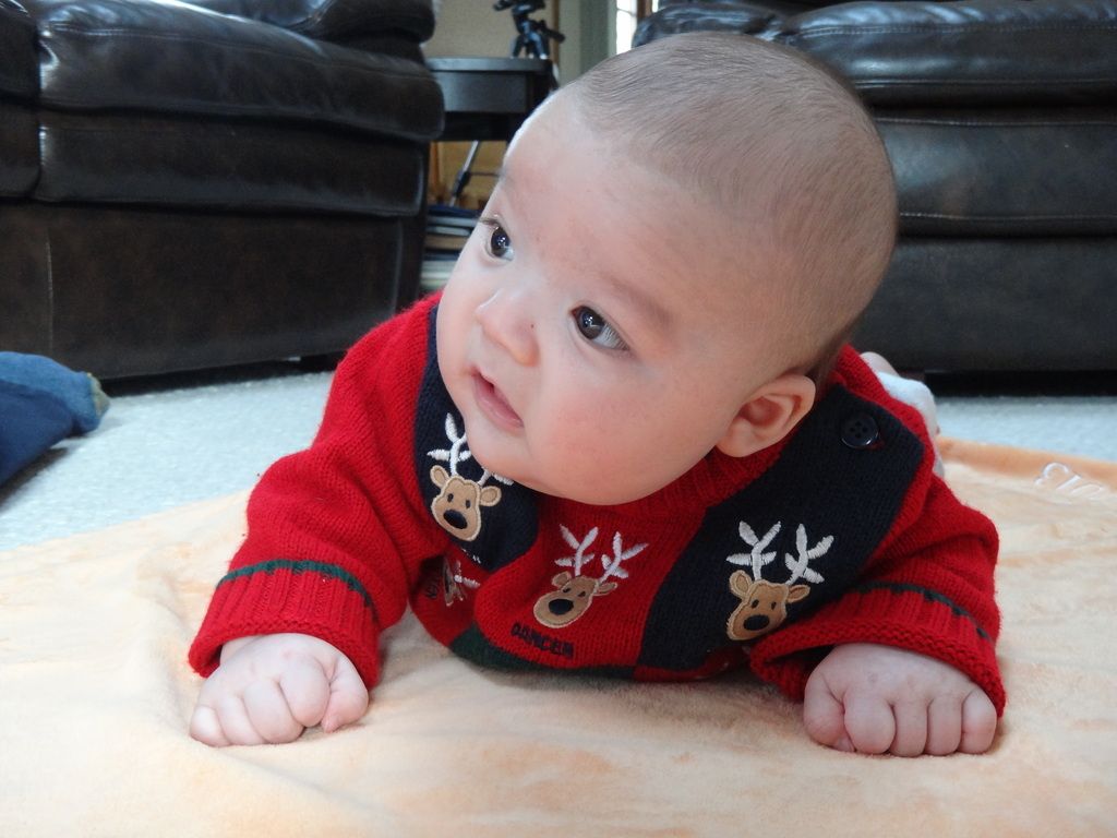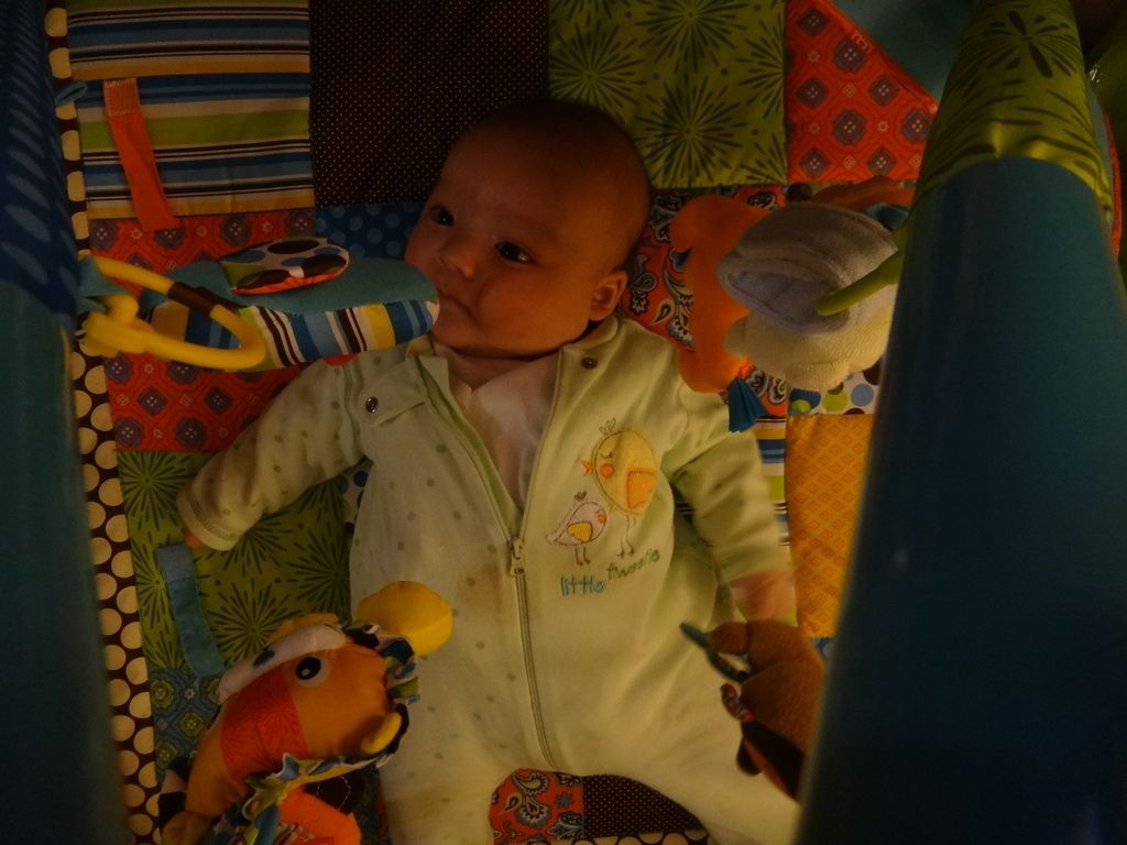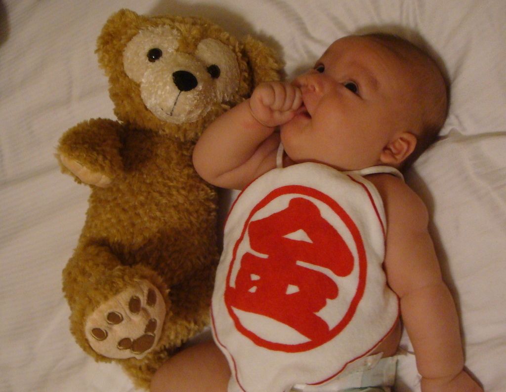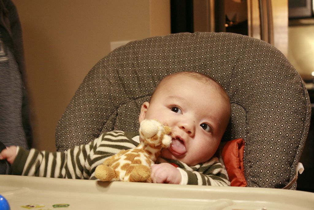 Sasuke playing with his giraffe. He's not picking things up yet, but if you put a toy in his hand he'll hold onto it for a while.