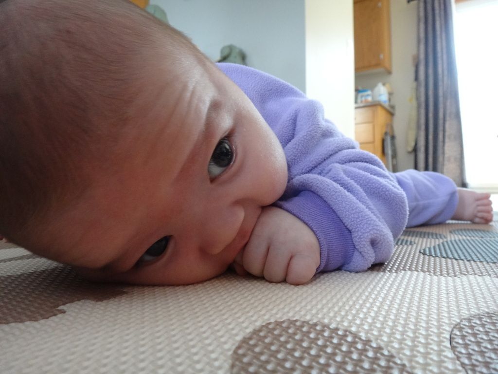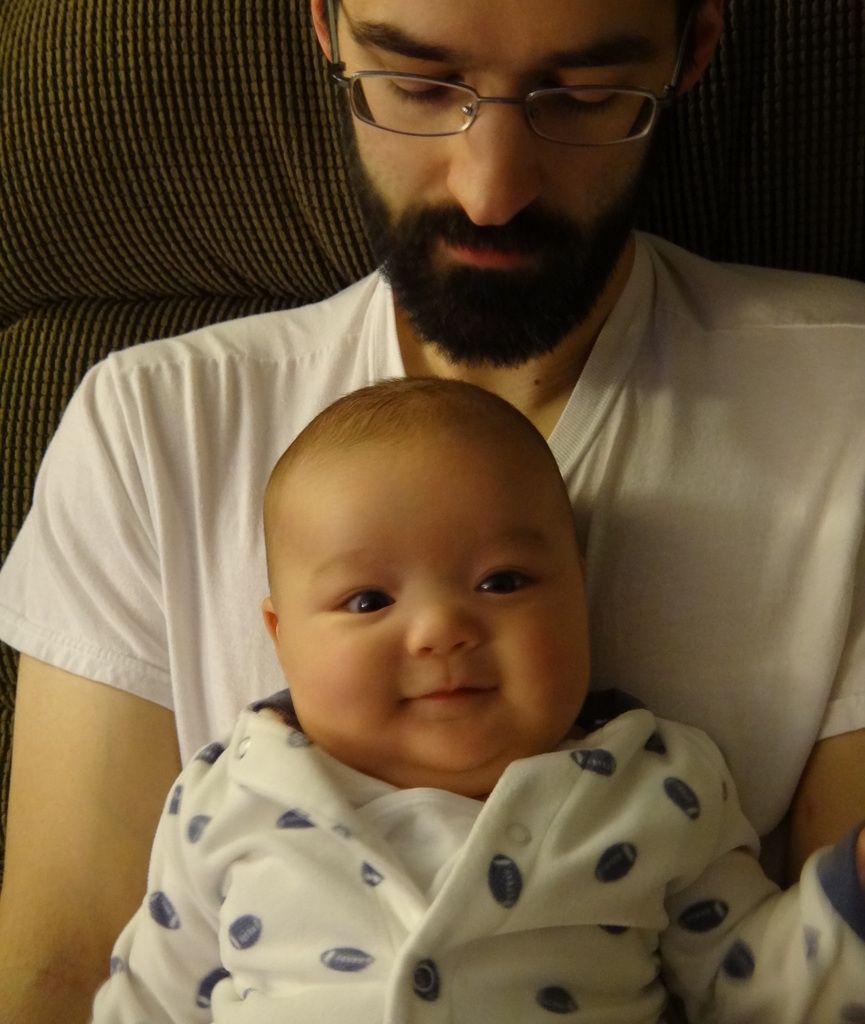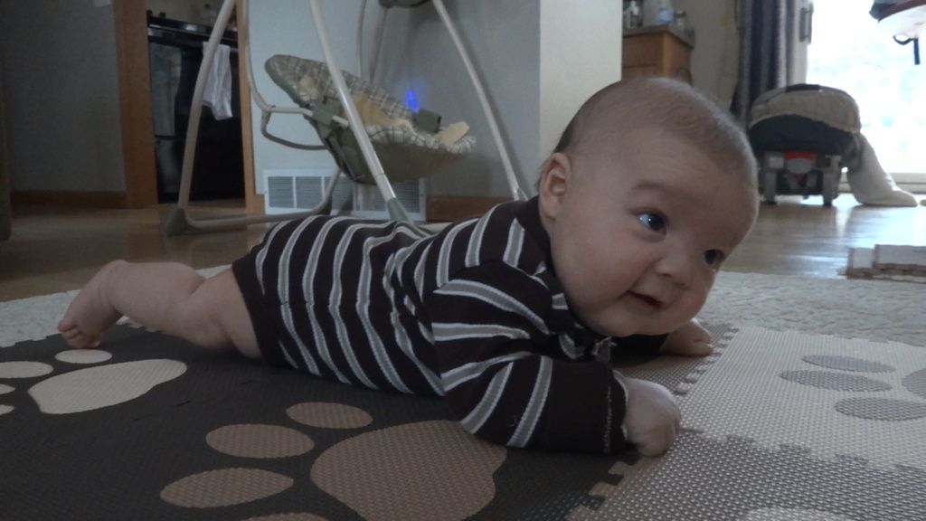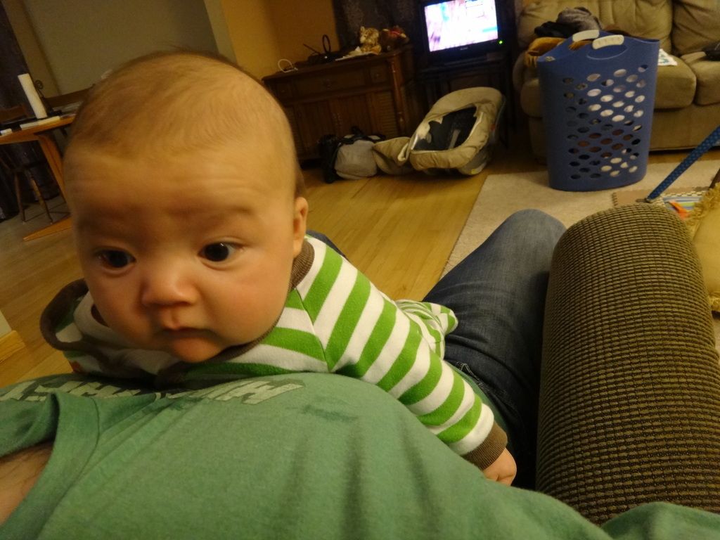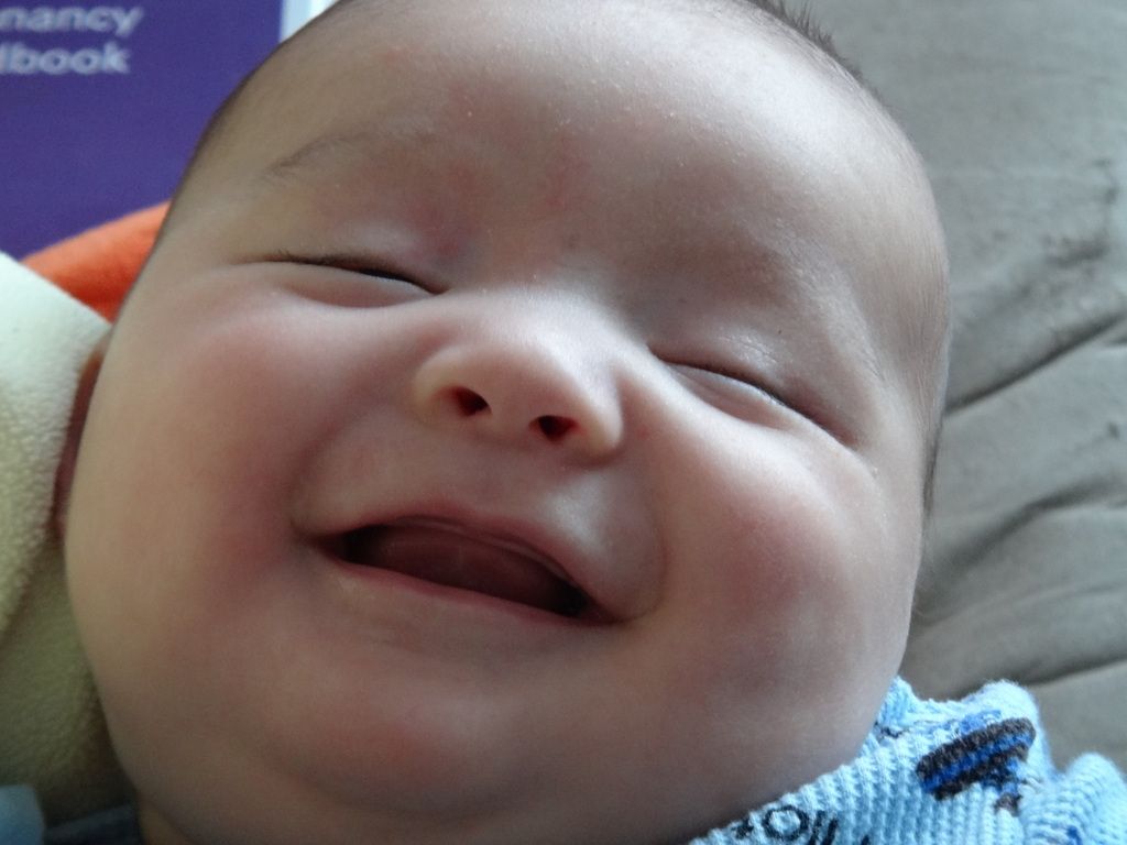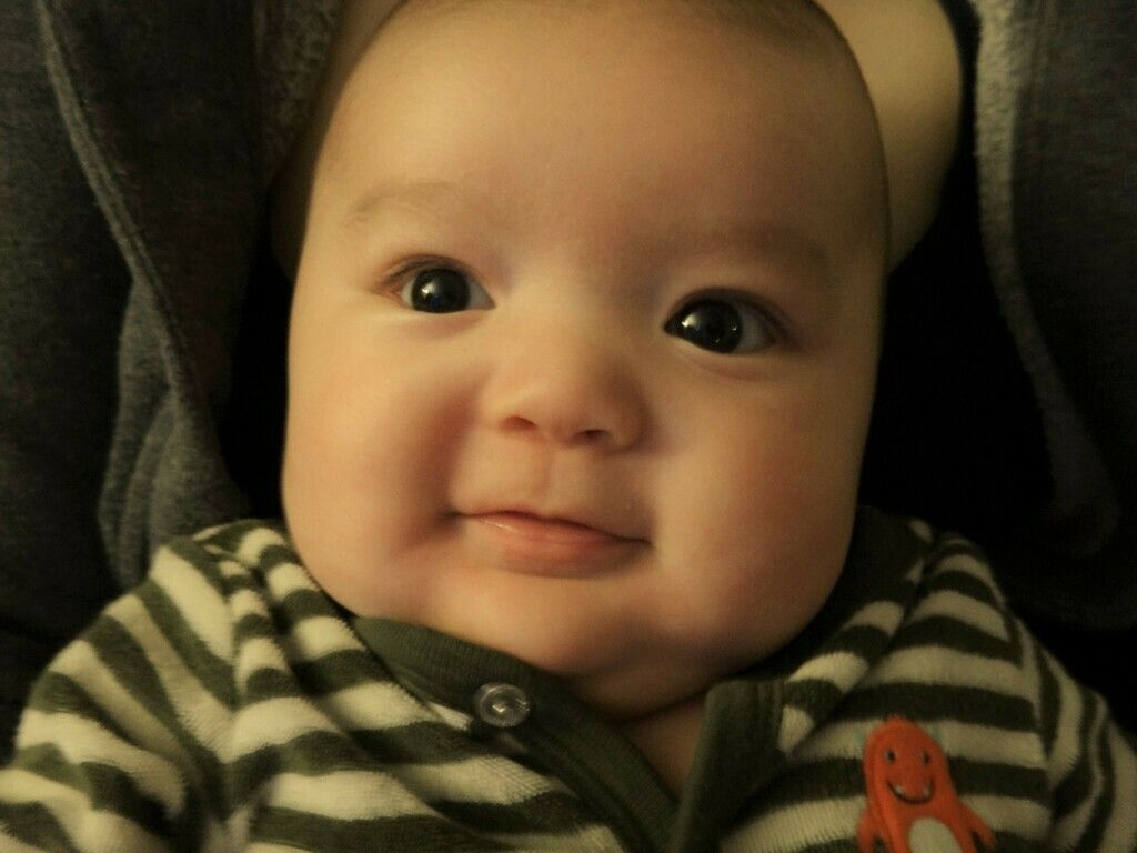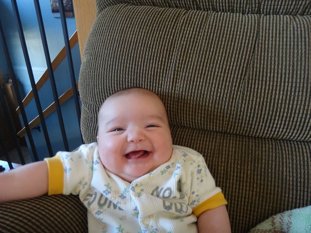 Sasuke playing with his giraffe. He's not picking things up yet, but if you put a toy in his hand he'll hold onto it for a while.