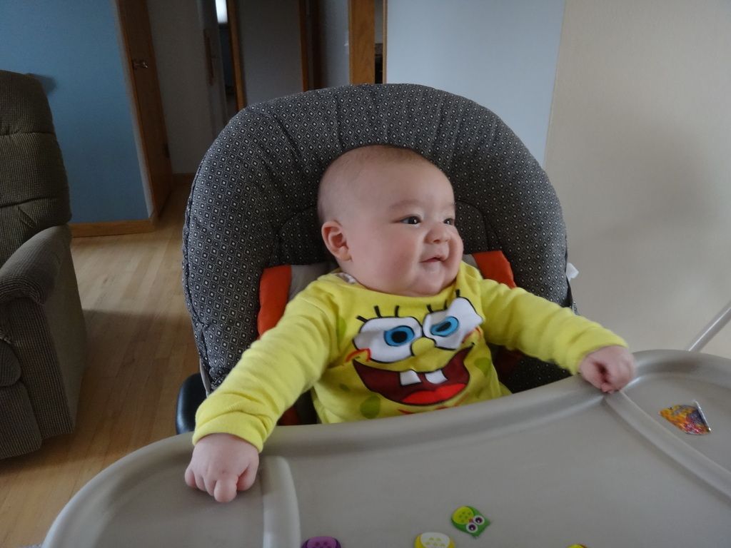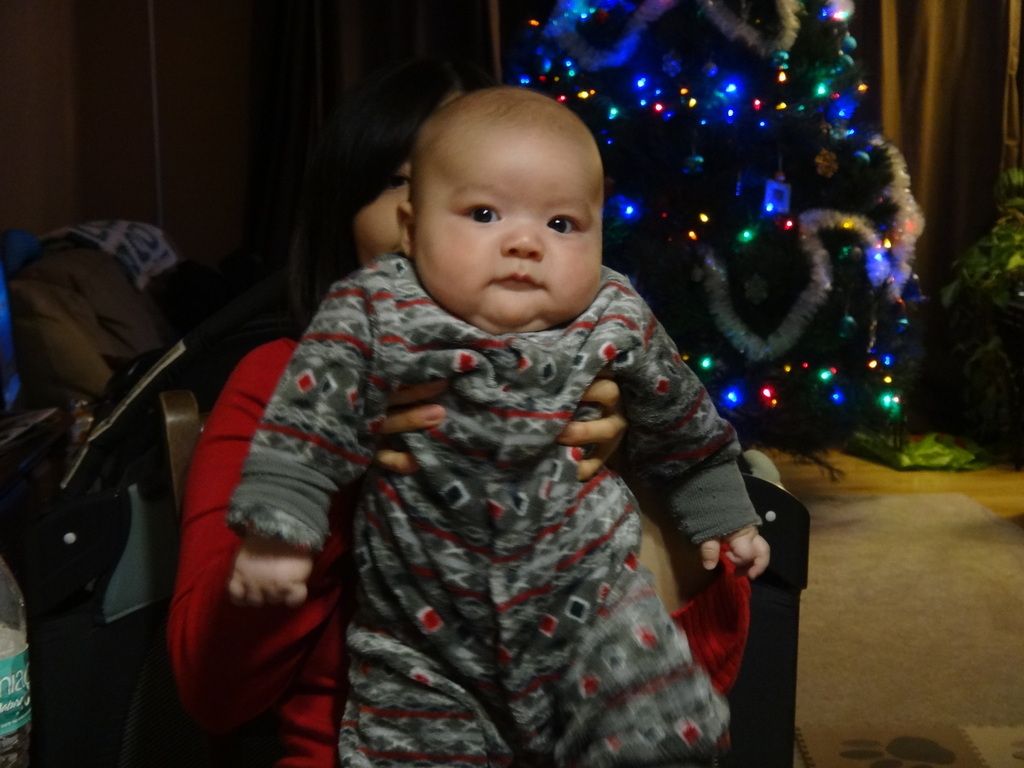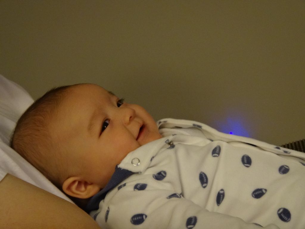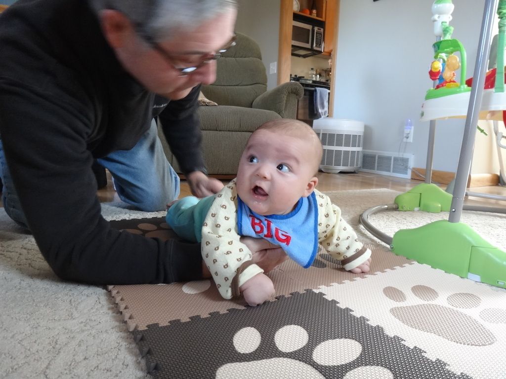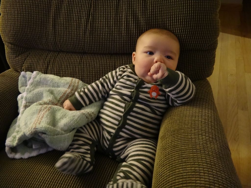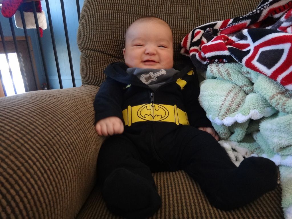 Sasuke playing with his giraffe. He's not picking things up yet, but if you put a toy in his hand he'll hold onto it for a while.