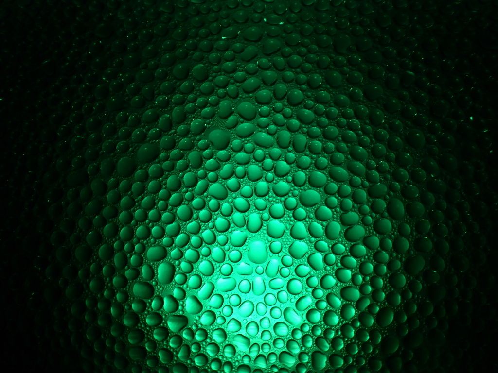 Condensation on plastic wrap over a tray of lime jello illuminated by a flashlight.