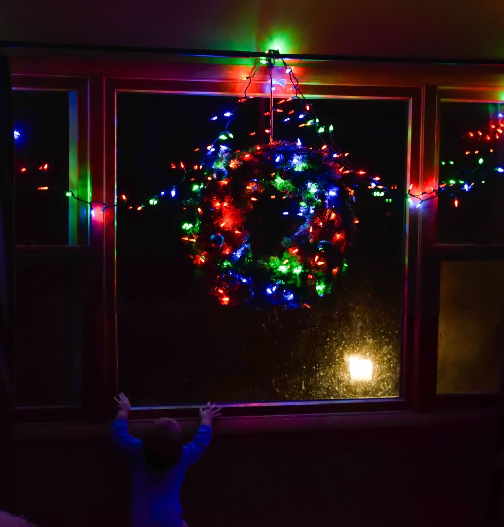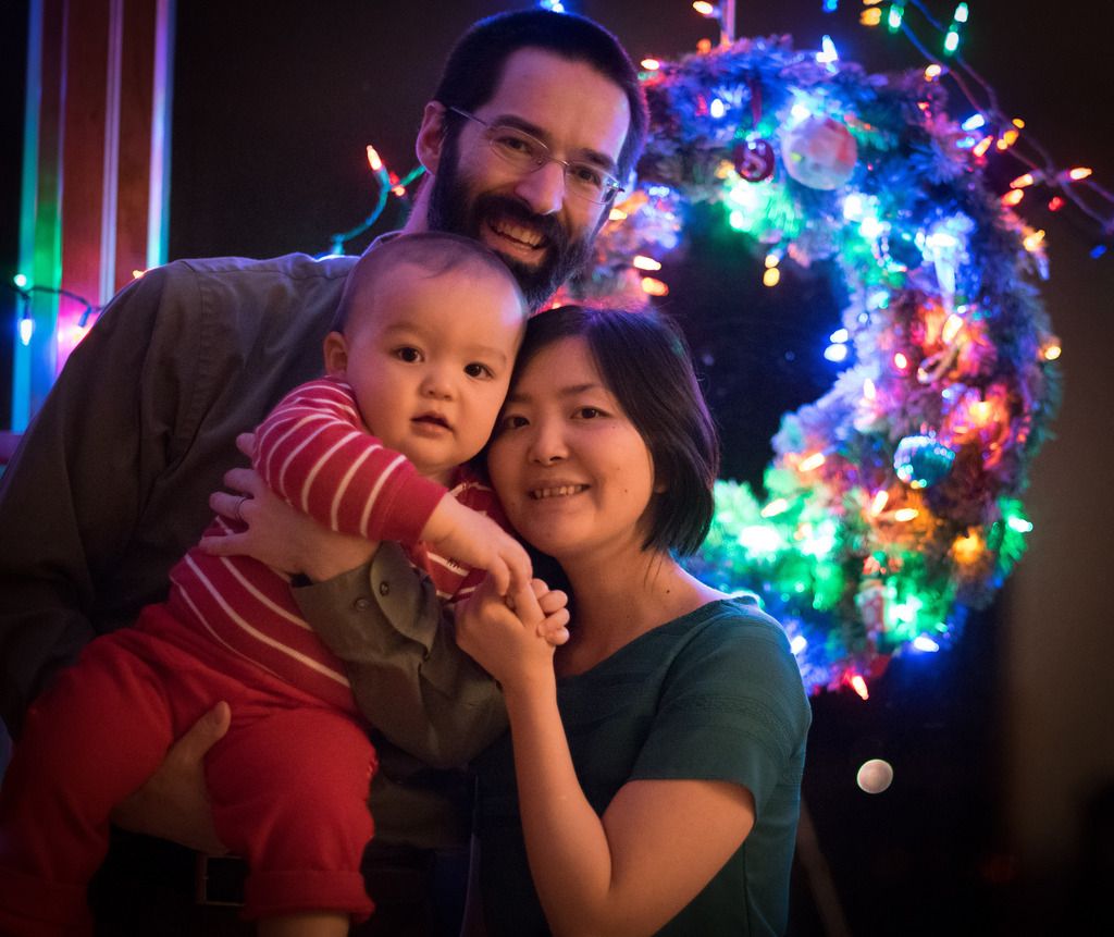 We setup a wreath after Sasuke went to bed last night, and this morning he saw it while it was still dark outside. He pointed and said "this! this!" Sasuke doesn't have many words yet, but "this" is a fairly handy one to have picked up. His first word was "Mama" at about 6 months. Now he has "ねね" (sleep), "om nom" (eating sound), "this!" and occasionally "up!"
