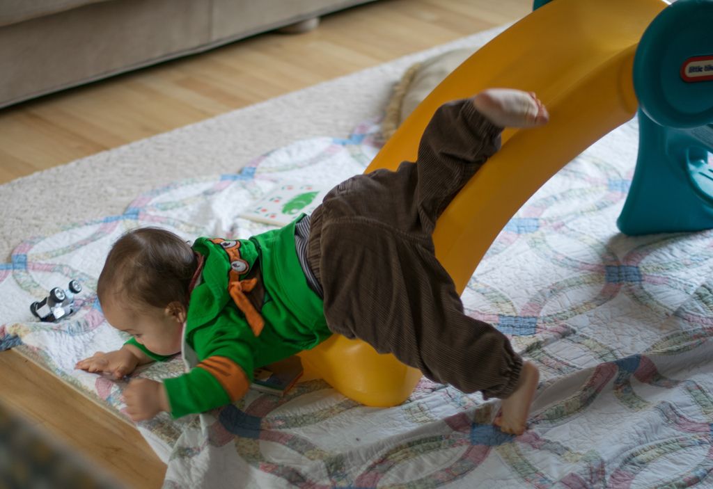 Sasuke likes going down the slide head first.