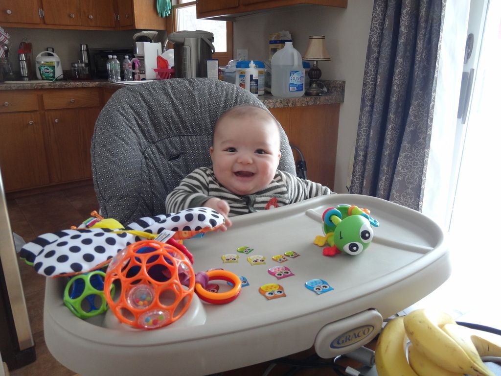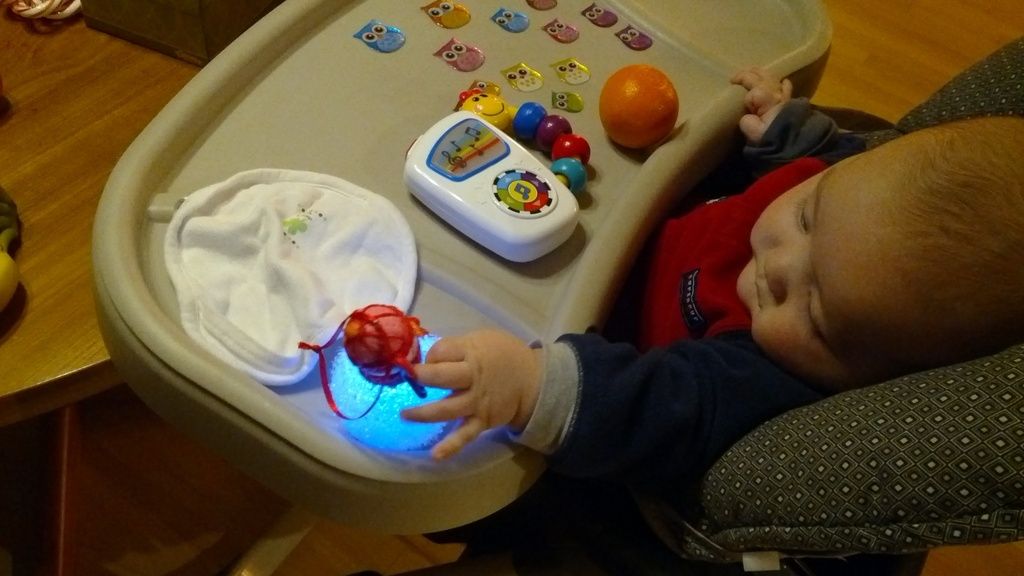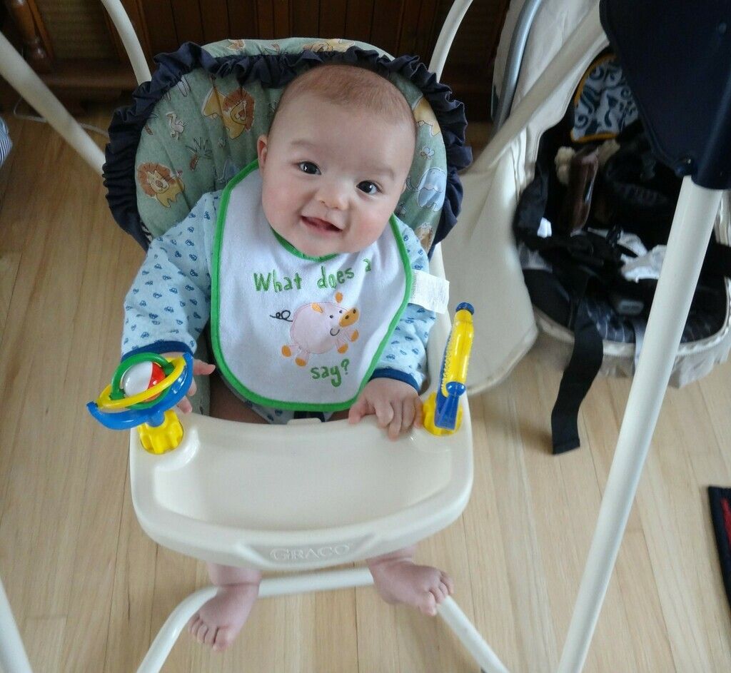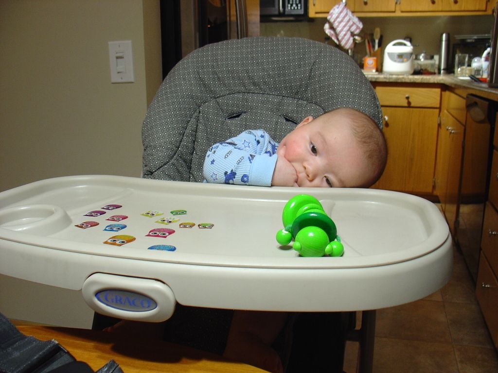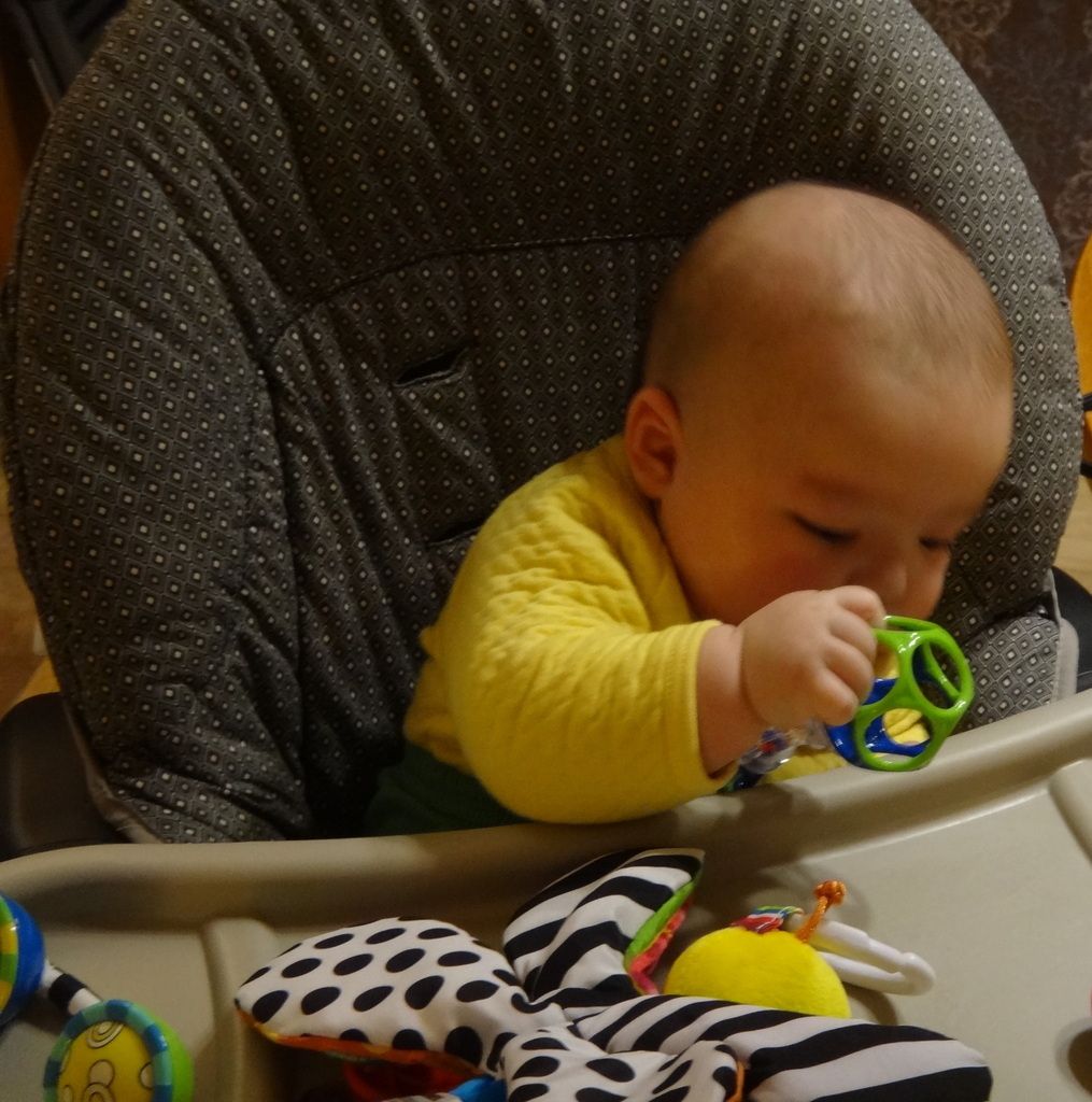 Sasuke playing in his highchair during dinner.