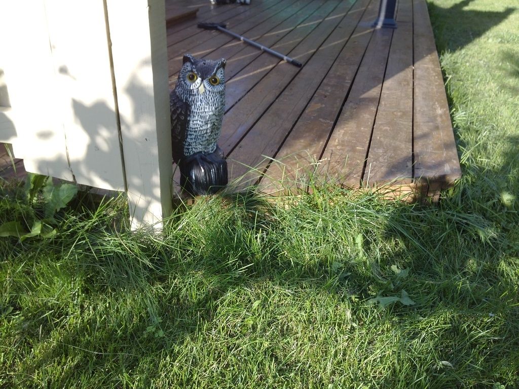 A coworker lent me his owl decoy to see if it would keep the rabbits out. I placed it facing the gate where they squeeze quite easily though.