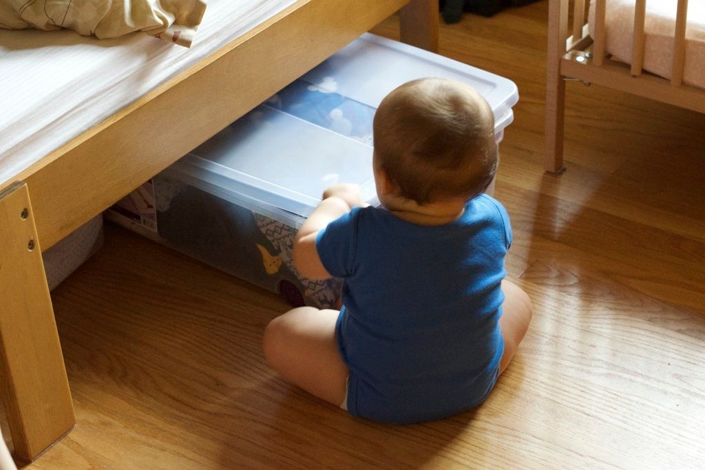 Sasuke likes to get into the storage boxes under the bed in his room.
