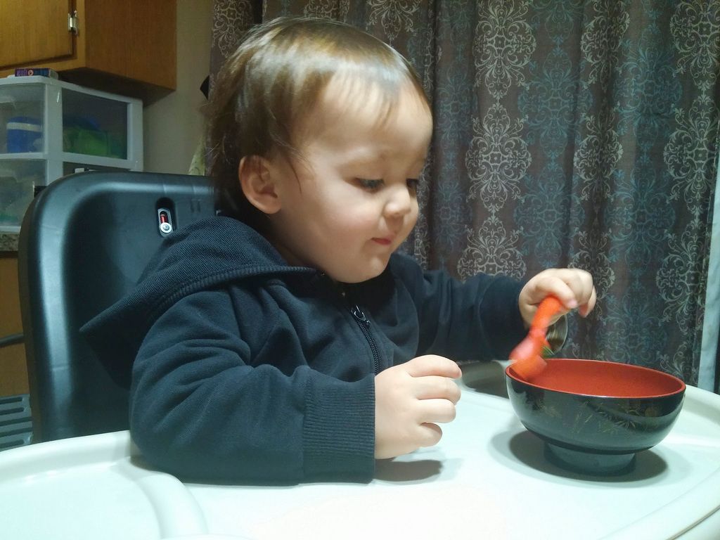 I gave Sasuke some yogurt with pomegranate and must have said, "here's your dessert." While washing dishes he called out, "more jii jiit?" I didn't understand until he held out his empty dish. We practiced and now he can say "dessert" pretty well. He's saying a new word almost every day now.