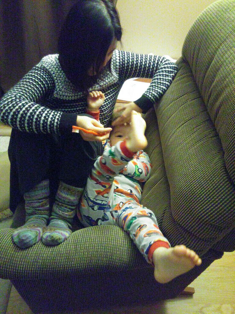 Sasuke caught a stomach bug and wanted to go to bed about and hour and a half early. I stayed with him until Masami got home.