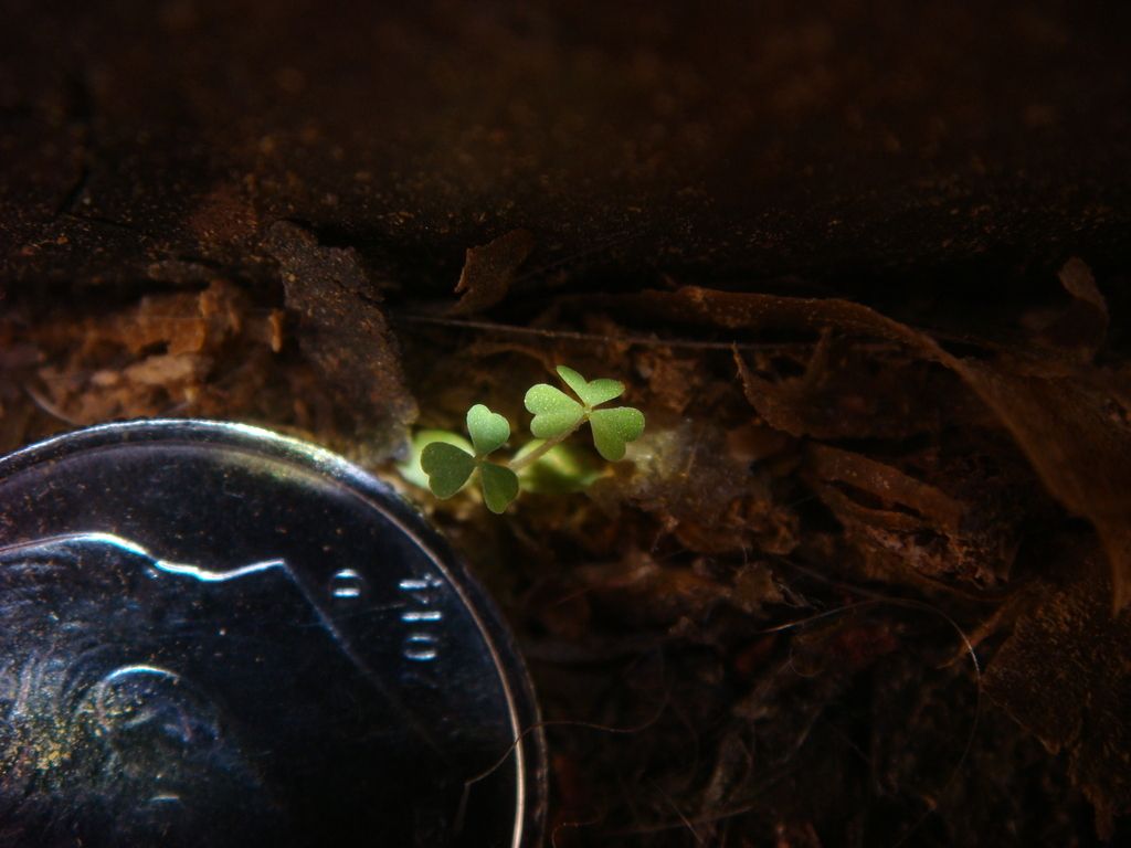 I saw these two incredibly tiny clovers peaking up from between some deck boards. I had to take a macro shot. I used my Sony T100 and a bicycle flashlight.