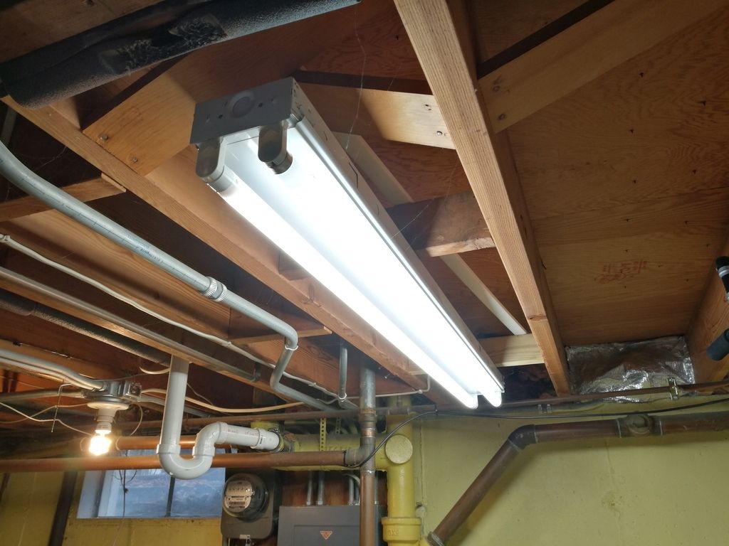 I replaced the burned out florescent tube with a drop-in LED replacement. It's just as bright and plastic so if a broom handle or basket ball hits it you won't get shards of glass and mercury vapor everywhere. I'm debating whether to let the other one burn out or just replace it now.