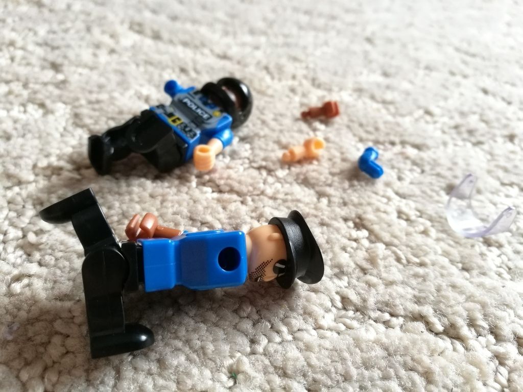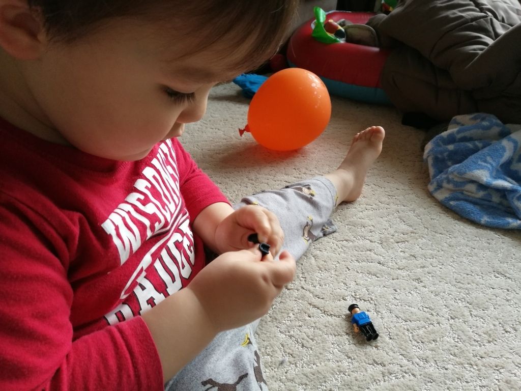 Every tiny piece comes apart on these. If we have even one complete Lego guy next week I'll be surprised.