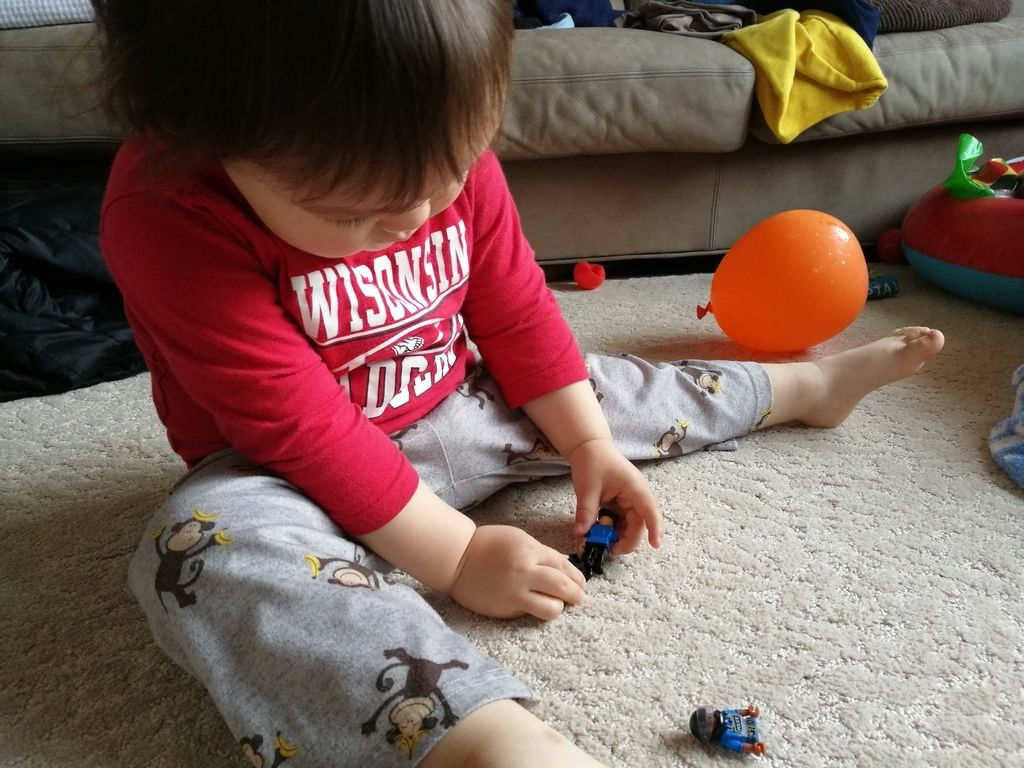 Sasuke's been drawn to the Legos in the toy aisles lately, so Masami bought him a $1 pack of Lego policemen.