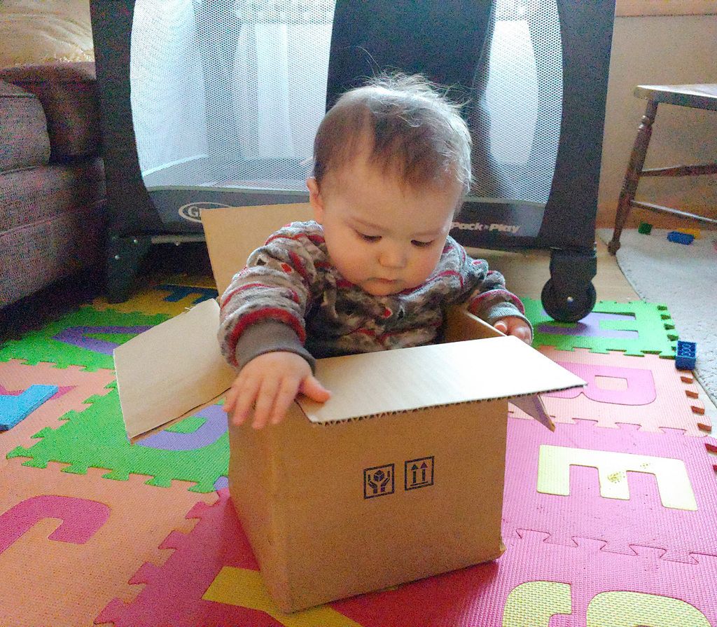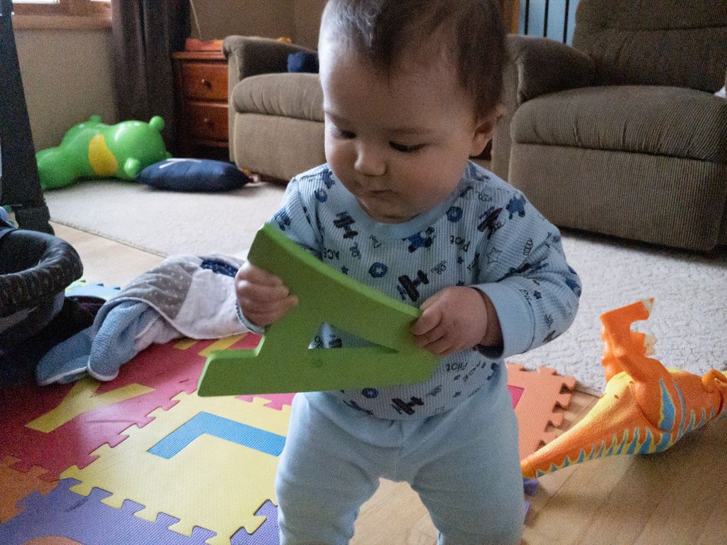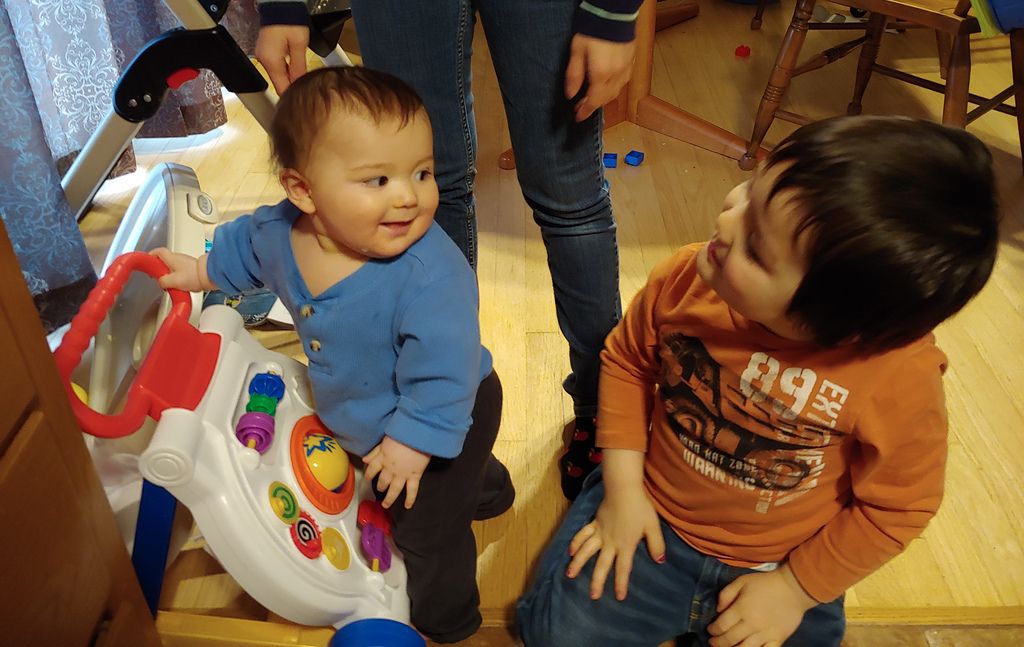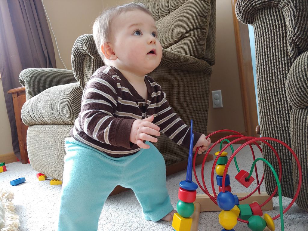 Kenny's standing up on his own, but he's not very stable so it's pretty dangerous.