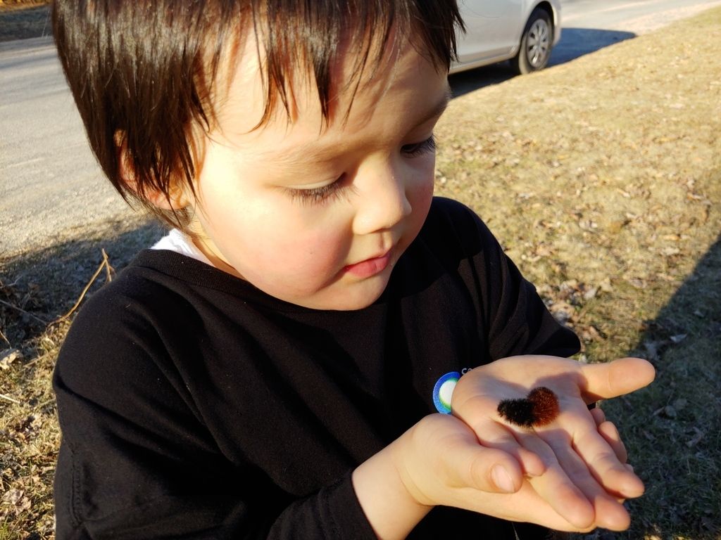 He found a wooly bear. Don't worry, they're not venomous. That's an old wives tale. It's a baby moth.