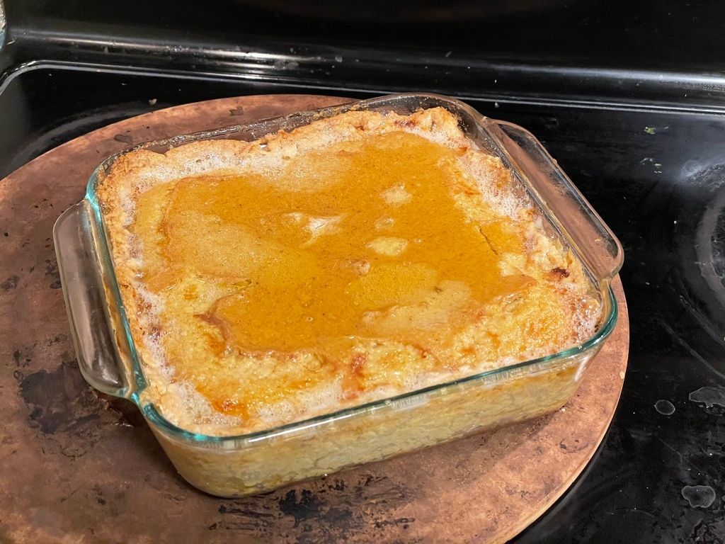 Pumpkin pie from an actual pumpkin we bought from a farm. It looks silly in our square pan, but smells amazing.