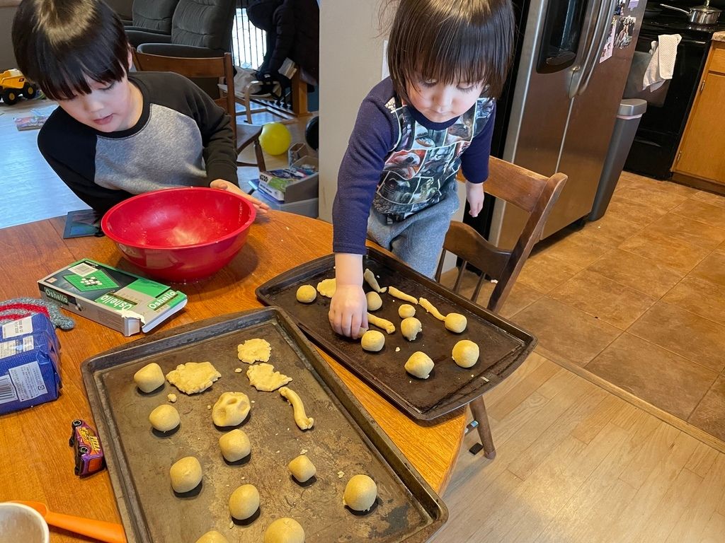 I couldn't persuade either kid to make balls of cookie dough. Kenny wanted snakes and Sasuke just did whatever came to mind.